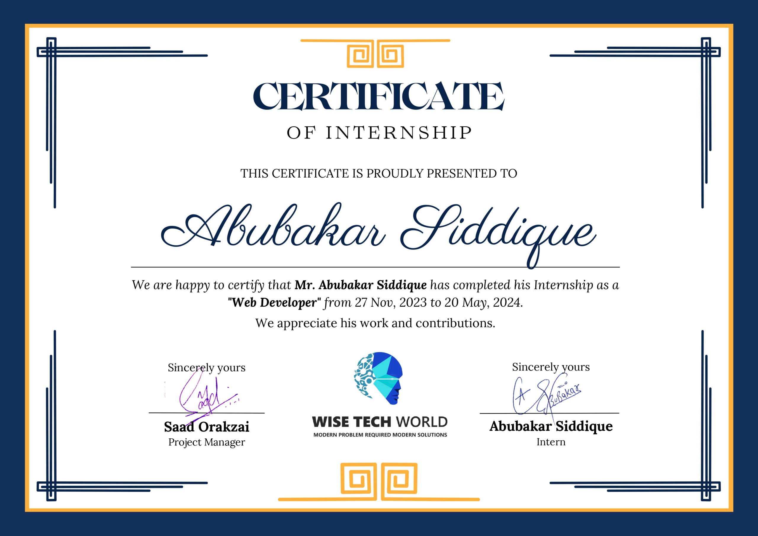 I have successfully completed my internship as a Web Developer at Wise Tech World. Over the course of six months, I had the opportunity to contribute to various projects, enhance my technical skills, and gain valuable industry experience.
