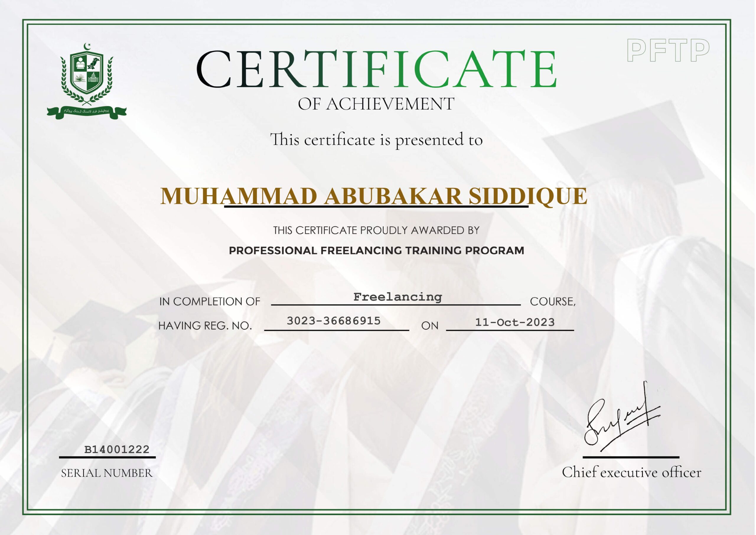 I am proud to announce the successful completion of the Professional Freelancing Training Program. This certification marks a significant milestone in my journey to enhance my freelancing skills and expertise.